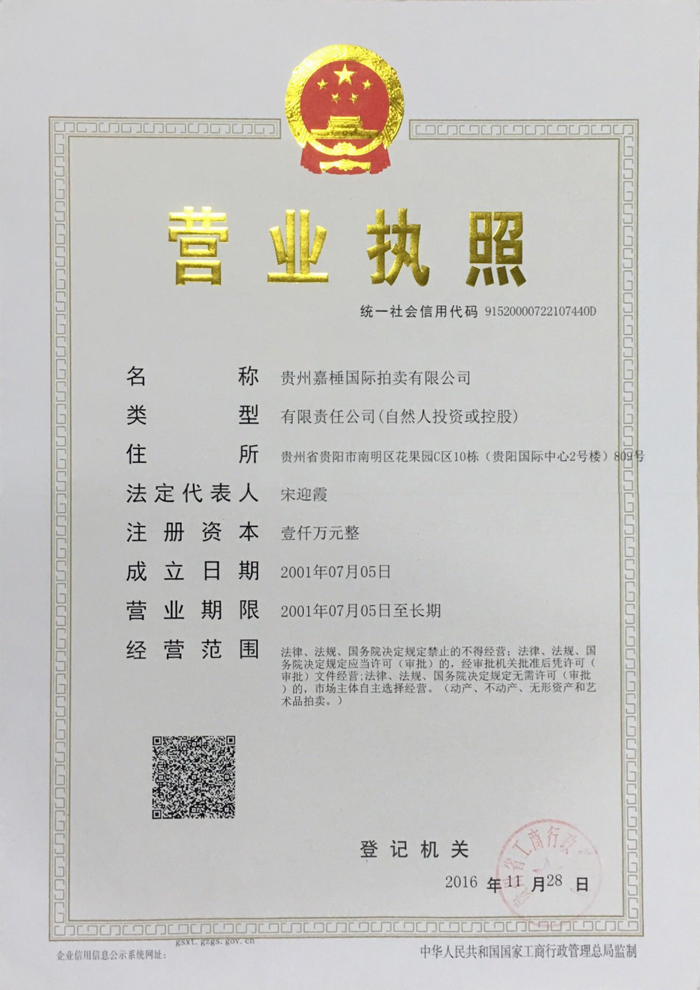 貴州嘉棰國際拍賣有限公司是主要從事動產、不動產、無形資產和文物藝術品拍賣業務的大型綜合性拍賣企業,是中國拍賣行業協會會員,貴州省拍賣行業協會理事單位,中國拍賣行業協會AA級資質企業,貴州省連續十一年重合同守信用企業,全省拍賣先進企業,貴州省公物拍賣人。公司充分利用多年來積累的客戶資源和全新的經營理念服務于貴州經濟發展。同時也為貴州省國有企業的資產重組、改制改造以及不良資產的變現,起到積極的作用。貴州嘉棰國際拍賣有限公司自成立以來,多次成功地組織了房產、土地、機器設備和各種物資等標的拍賣。并于2001年12月成為第一批貴州省高級人民法院及多家金融機構指定的拍賣企業。 公司下設產權部、市場發展部、財務部、人事部和辦公室。現有員工11名,大專以上學歷員工占總數的90%,擁有精通業務的專門人才。有國家注冊拍賣師3名,公司工作人員大多參加過中國拍賣行業協會組織的從業資格培訓。公司堅持“客戶至上,執業嚴謹,公平競.....